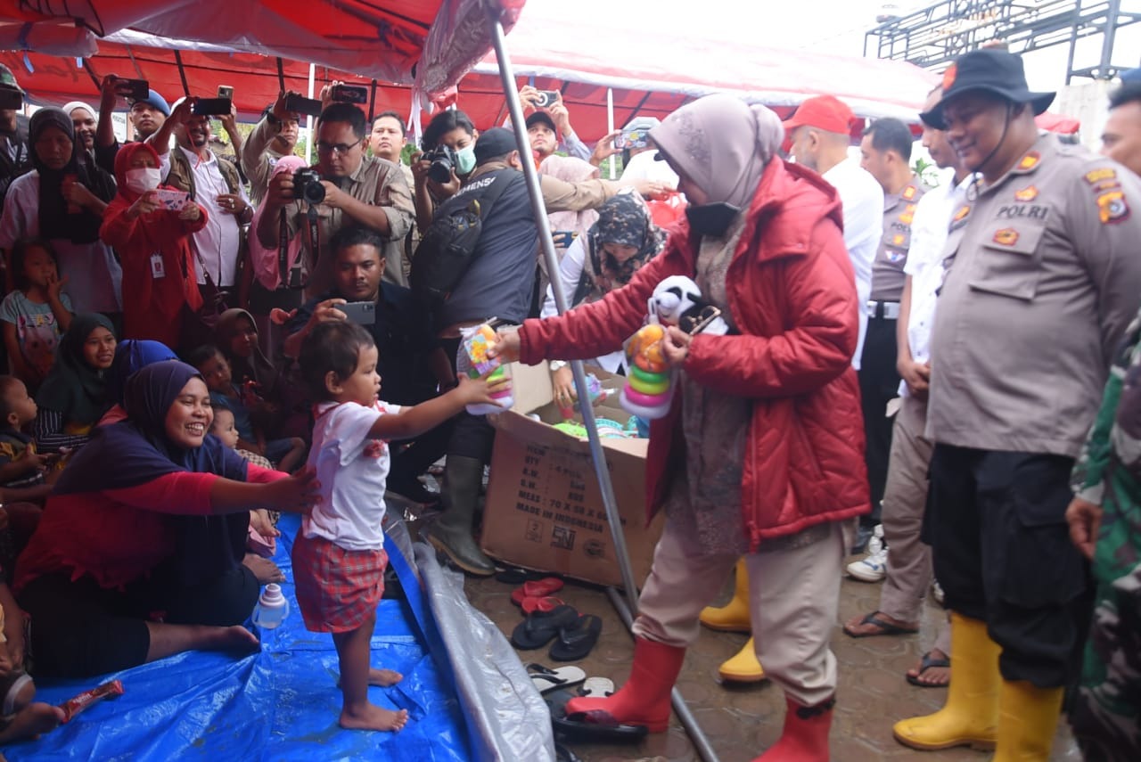 ACEH TAMIANG – Menteri Sosial Tri Rismahariani mengunjungi korban terdampak banjir di Kecamatan Bendahara Kabupaten Aceh Tamiang, Rabu (9/11/22). Dia
